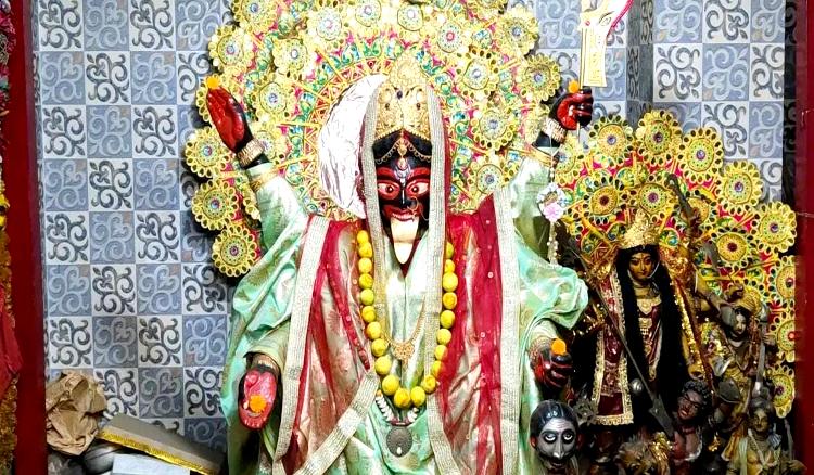 দেবী স্বর্ণালঙ্কারা। দেবী মূর্তির সমগ্র দেহ অসংখ্য স্বর্ণালঙ্কারে ভূষিত, মাথায় উজ্জ্বল সোনার মুকুট। দেবী চতুর্ভুজা। মায়ের ডান দিকের দুই হাত অভয় ও বর মুদ্রায়। মায়ের বাম দিকের দুই হাতে থাকে খর্গ ও নরমুণ্ড। মায়ের পায়ে শায়িত মহাকাল। দেবী দক্ষিণা কালী রূপে পূজিতা। মন্দিরে নিত্যপুজো হয়। দীপান্বিতায় জাঁকজমকপূর্ণভাবে দেবীর পুজো হয়।